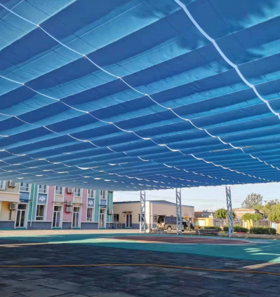 門頭溝幼兒園室外電動遮陽簾采用鋼絲折疊式遮陽簾,鋼架高度為6米,本工程應用面積1700平米。